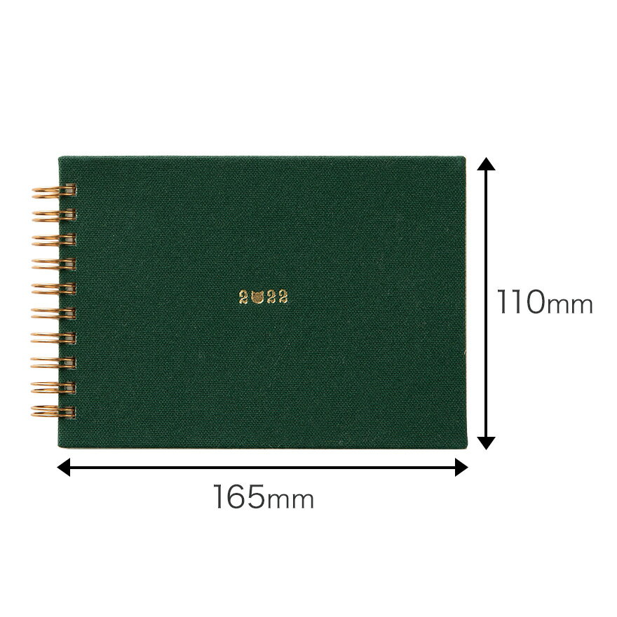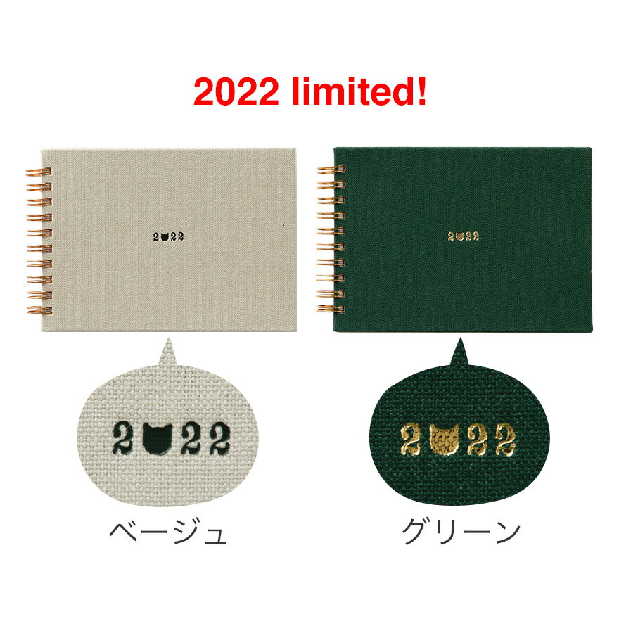 キャンバス地を貼った、しっかりした作りの表紙に2022の箔押しをしたシンプルな表紙で、 グリーン・ベージュは数字の0が猫のマークになった限定デザインです。