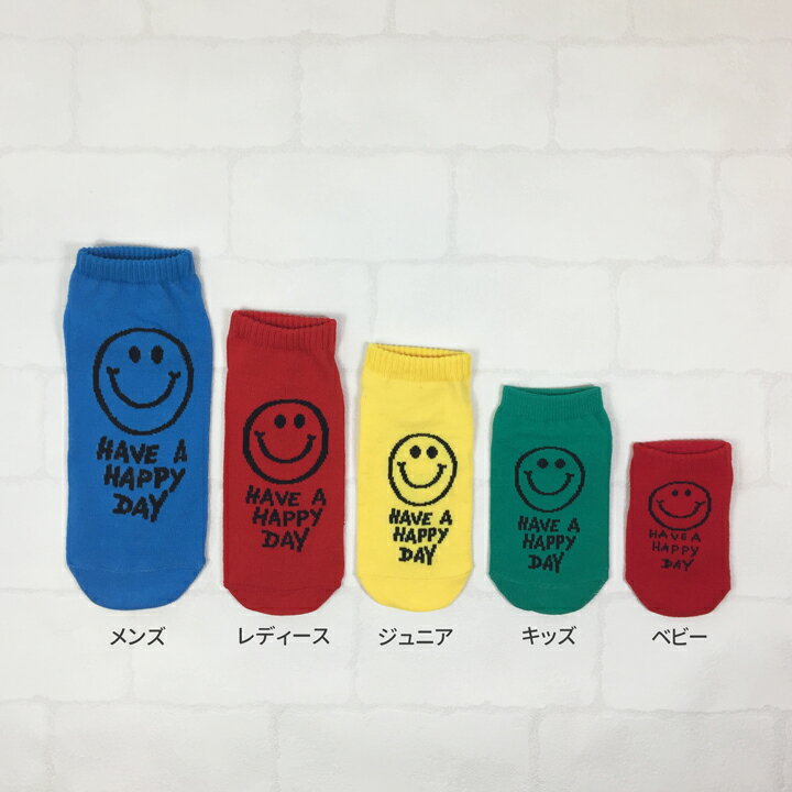 コーディネートしやすく おしゃれなデザイン ビビットでカラフルなカラーに、スマイルキャラクターとHAVE A HAPPY DAYという文字がプラスされたデザインくつ下。